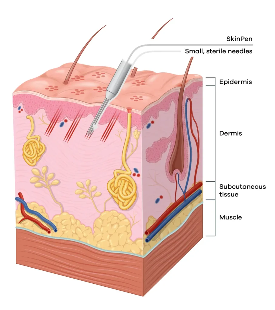 Creating microchannels of controlled injuries stimulates the skin’s collagen production and remodelling.